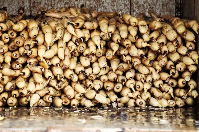 等到莲藕的终止叶背面的颜色带有一点点红色的时候以,就说明莲藕已经成熟,可以进行采收了。因为藕长的比较深,而且你又不知道它是怎么长的,所以你就要顺着它的终止叶慢慢的往它的原始叶方向挖去,这样挖出的莲藕才是最完整的。